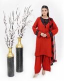 Turn heads with this rich crimson 3-piece ensemble featuring a textured stuffed lawn shirt and farshi shalwar, finished with a vibrant tie-and-dye chiffon dupatta embellished with lace. The traditional silhouette is ideal for festive wear with a luxurious twist.