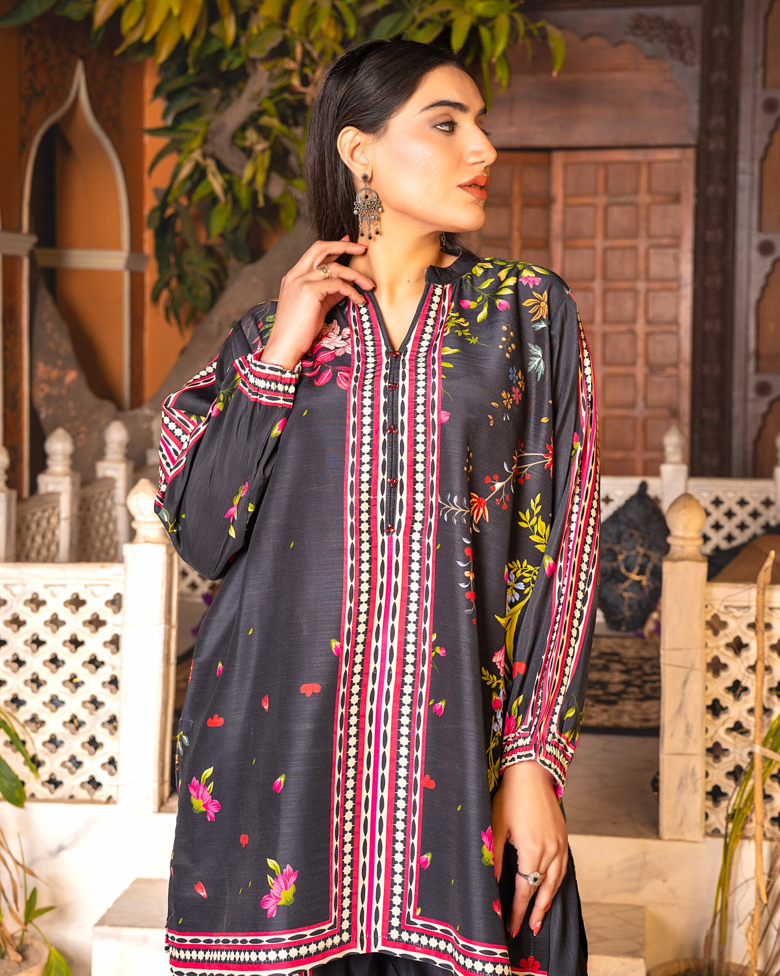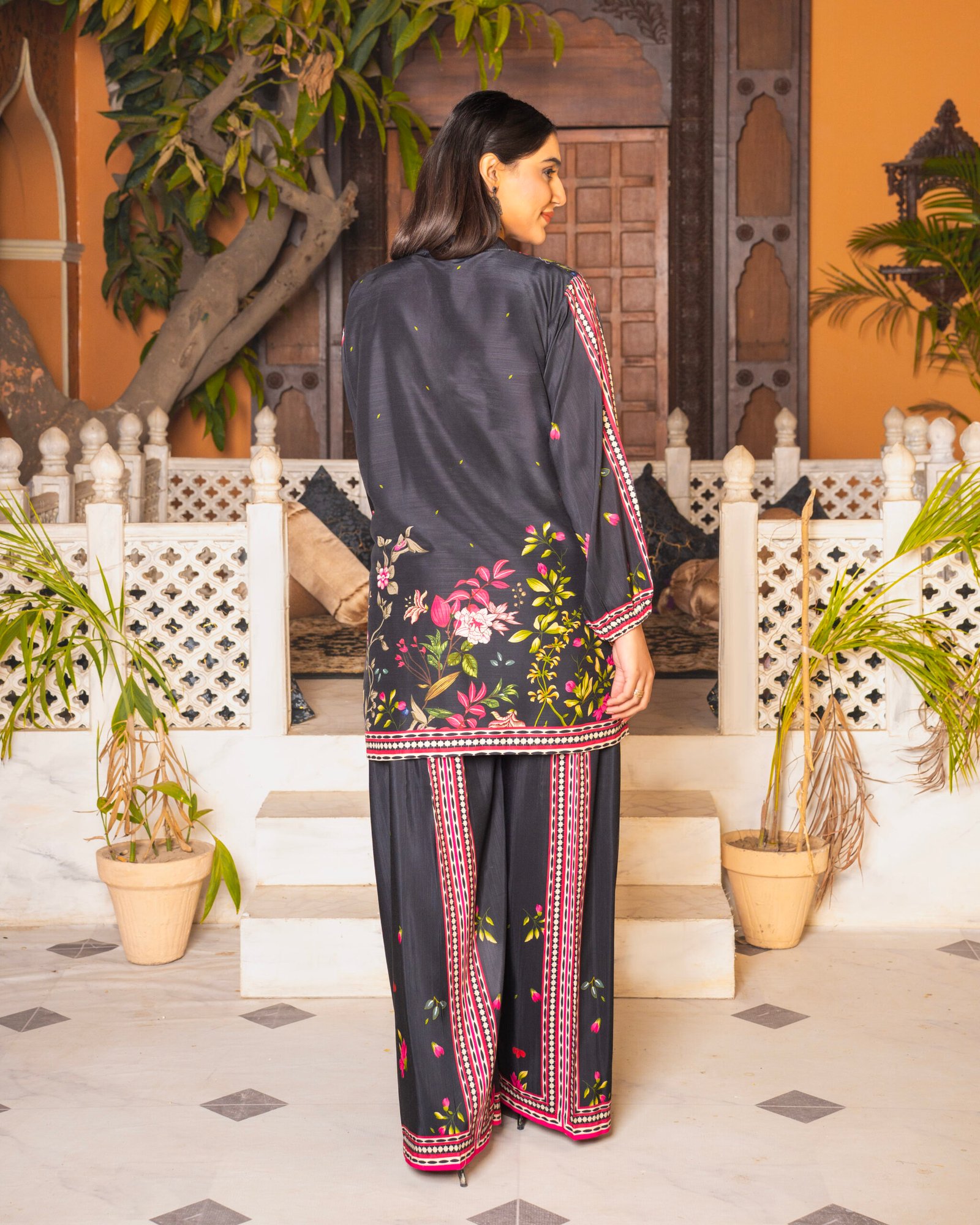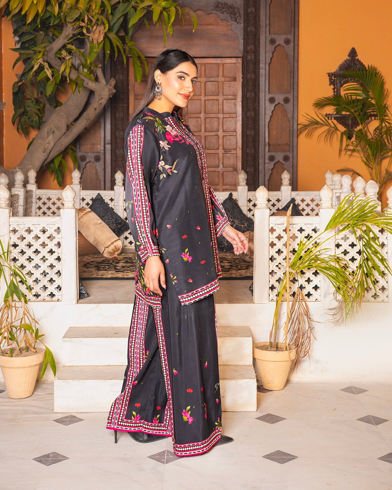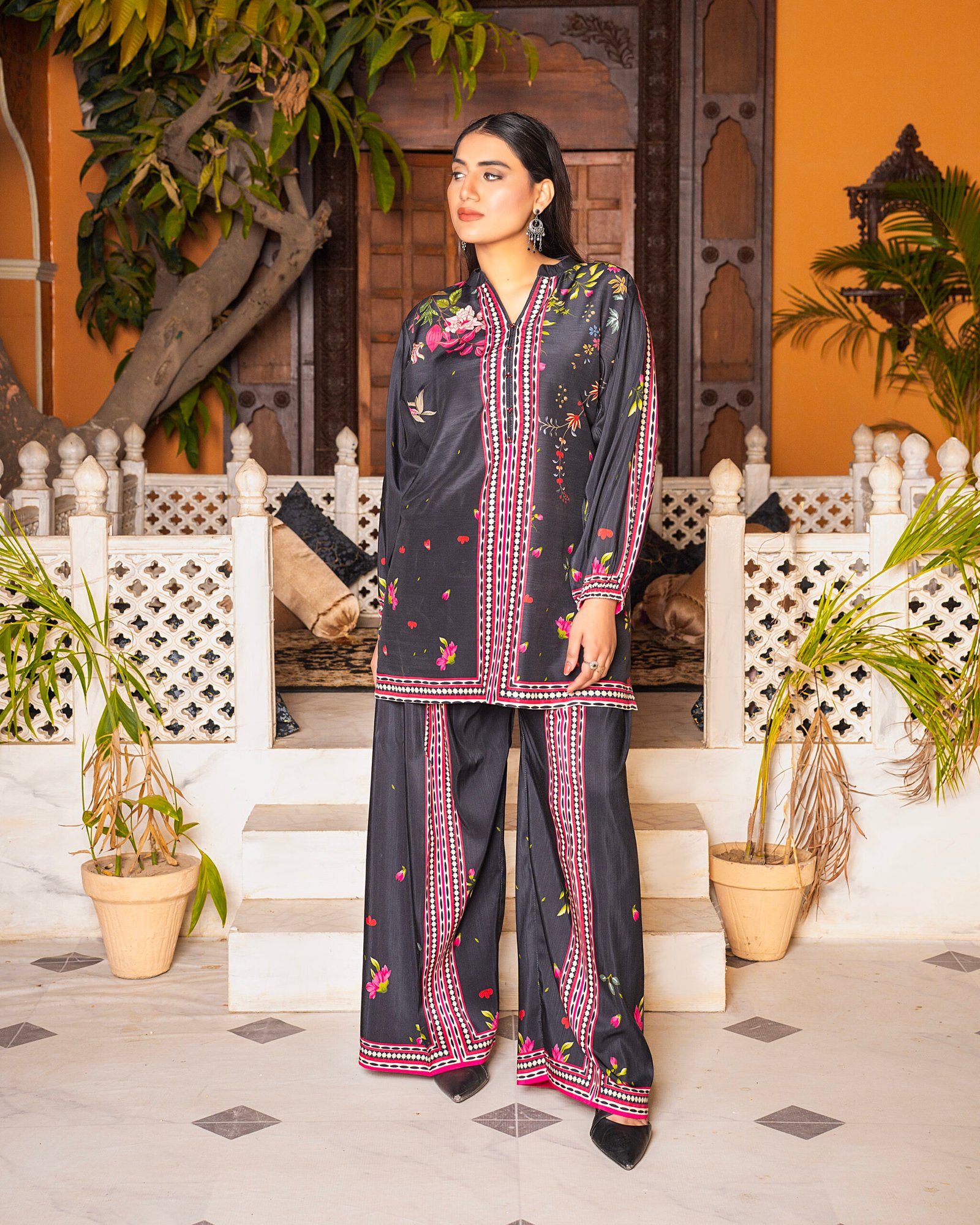 Make a bold statement with our “Midnight Noir” Co-ord set. This striking black outfit is adorned with vibrant pink and green floral accents, perfectly framed by intricate border patterns on the sleeves and hem. The sophisticated V-neckline and relaxed-fit trousers make it an ideal choice for both evening gatherings and stylish daily wear. A must-have “New Article” for your premium collection!